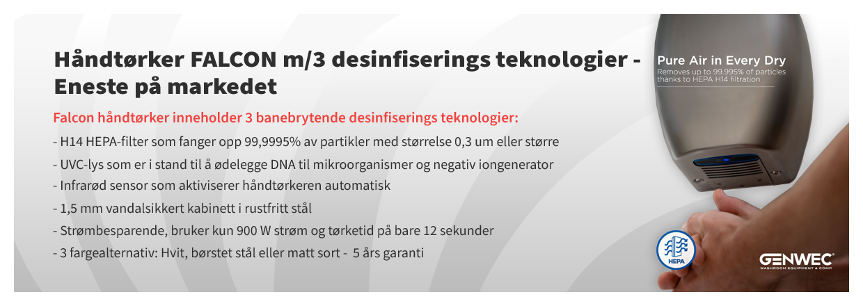 NYHET: Falcon håndtørker med 3 banebrytende og revolusjonerende desinfiseringteknologier: H14 Hepa filter, UVC-lys og negativ iongenerator. Eneste på markedet. Helt ren luft støttet av trippel desinfiseringsteknologi.