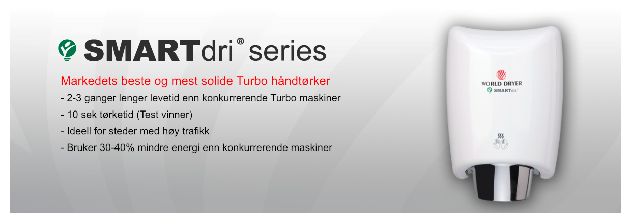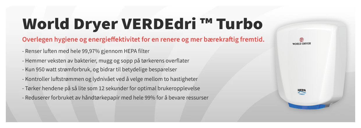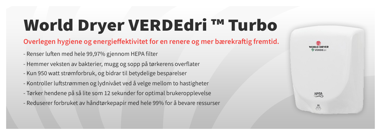 Vår spesielle Turbo håndtørker (Verde dri) som bl.a. anbefales av WHO (Verdens Helseorganisasjon) blir nå levert med Hepa filter som renser luften 99,97% for bakterier. Besparelsen på å bruke en håndtørker kontra håndtørkepapir nærmer seg 95%. Vi har hjerte for miljøet og sier følgende: Tenk miljø – papir adjø!